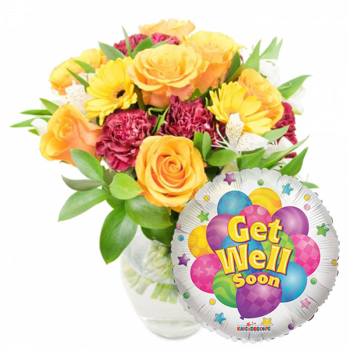Send a burst of color and positivity with our Radiant Recovery Floral Arrangement. This stunning bouquet features luminous yellow roses blended with charming germinis and vibrant red carnations, all enhanced by a unique "Get Well Balloon" to express your heartfelt wishes.
